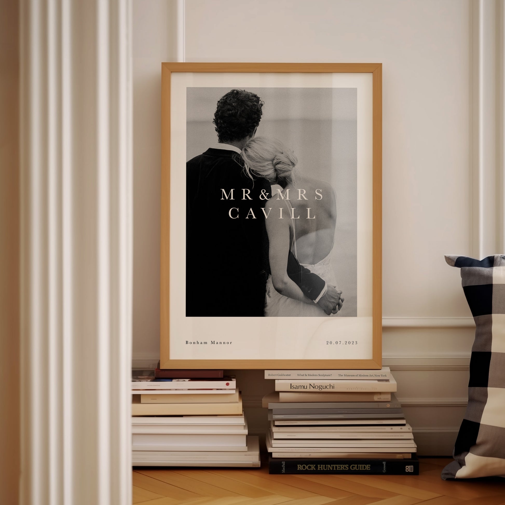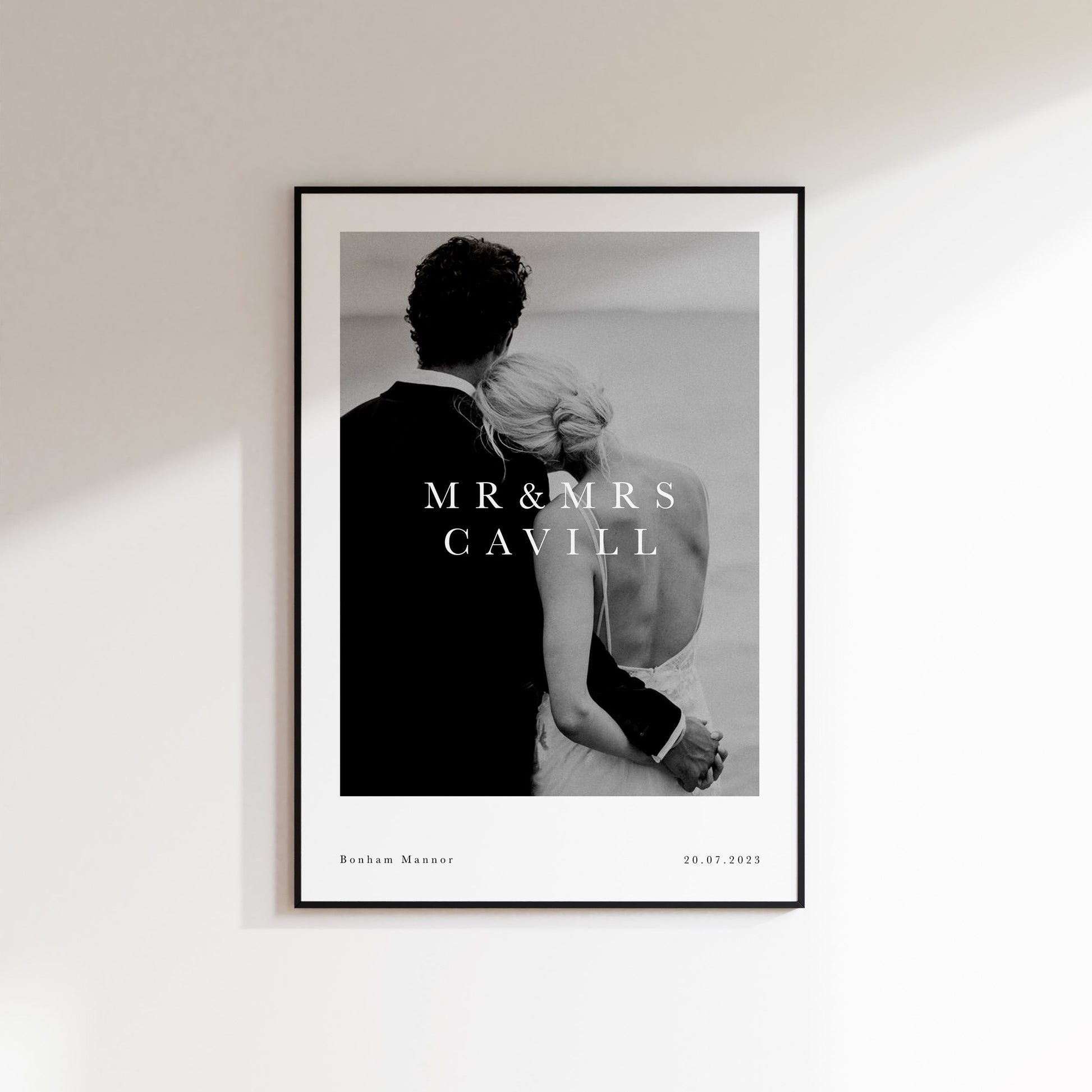 Transform your cherished memories into a unique piece of art with our personalised name photo print, the perfect wedding gift for newlyweds or memory piece for your new home. This beautifully crafted print features a photo of your choice, overlayed with bespoke text chosen by you, and more custom text in the bottom left and right. This makes for the perfect way to remember locations, dates or any other special details of your favourite memory.
