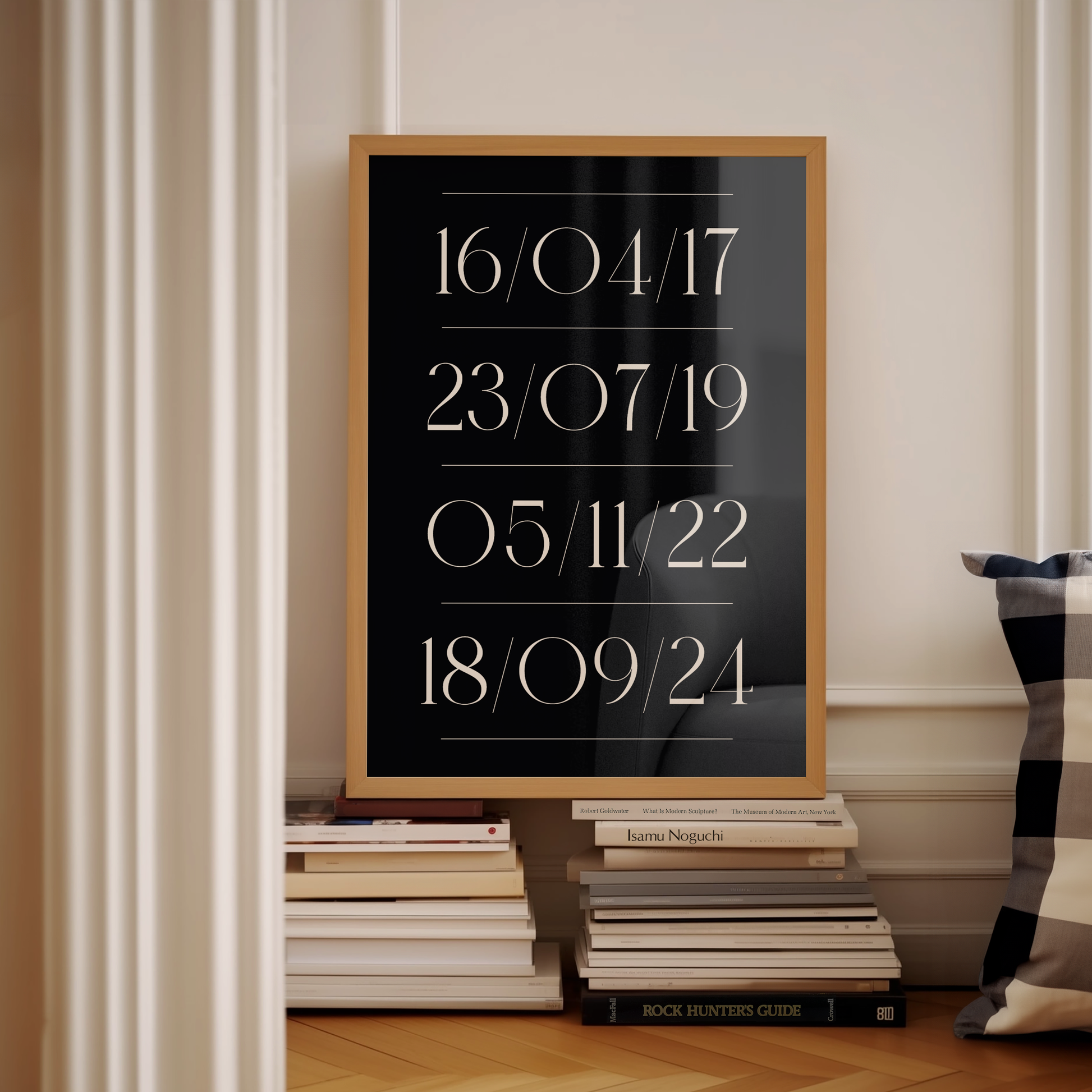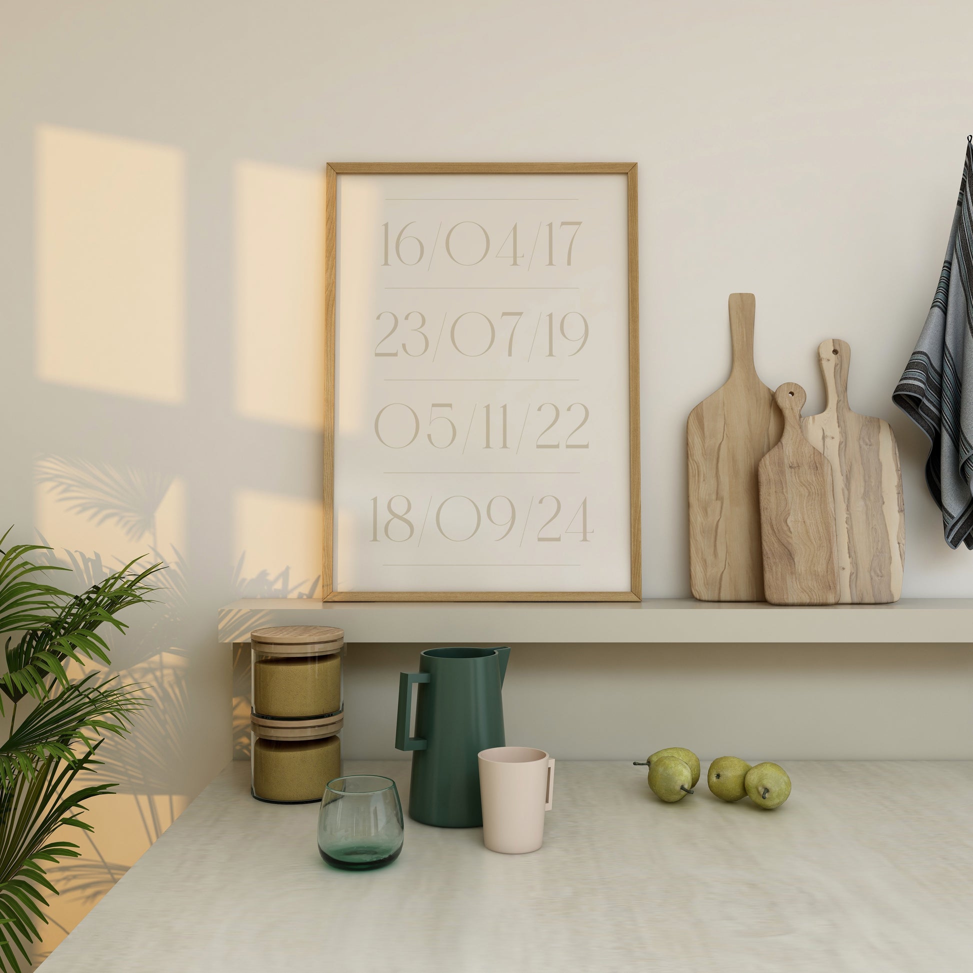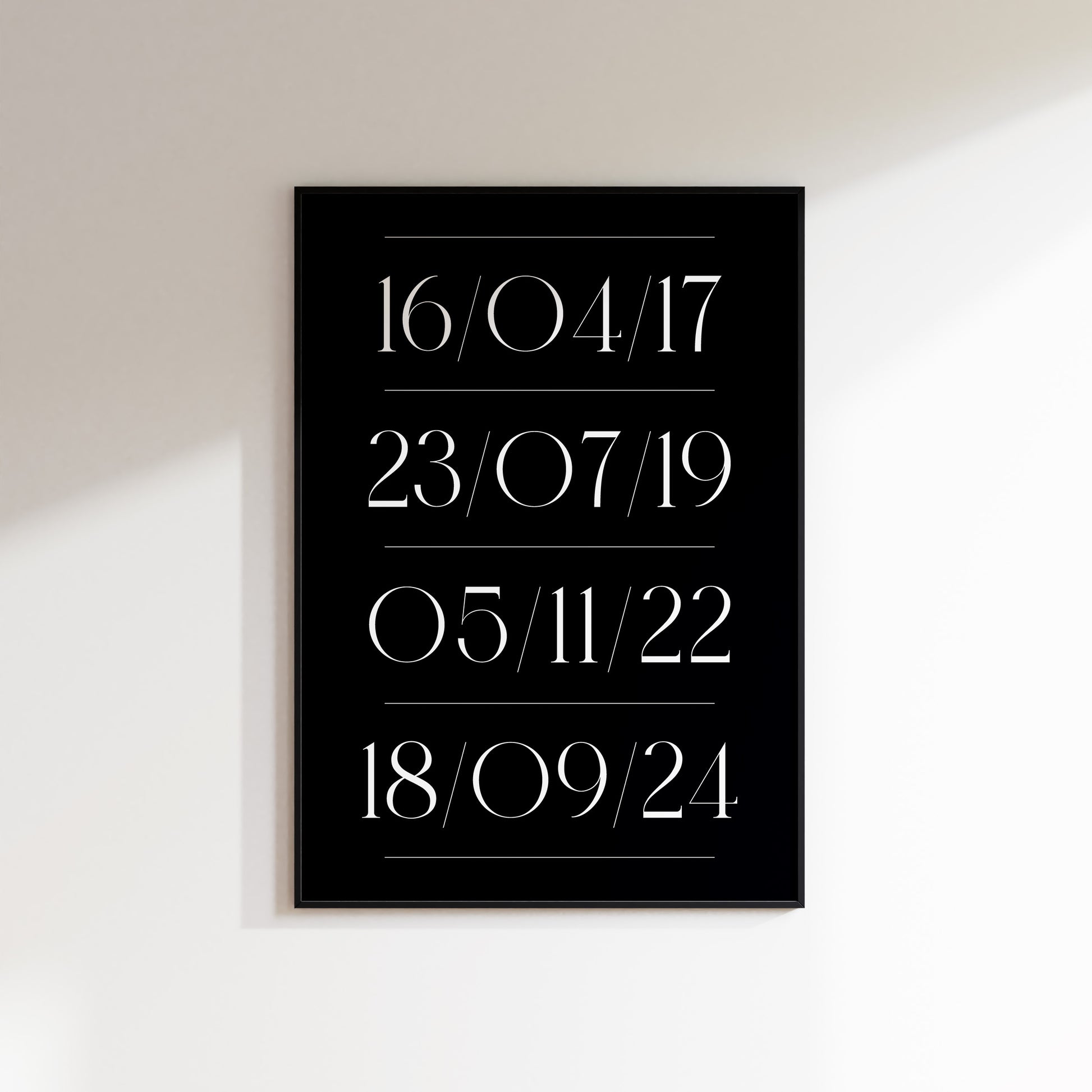Discover the Personalised Deco Four Dates Print, a stunning piece in our custom modern minimalist range of home prints. Choose 3-5 dates that represent special moments, whether it's family birthdays, the stages of your relationship, the dates you moved into each home, or even the birth of each child.