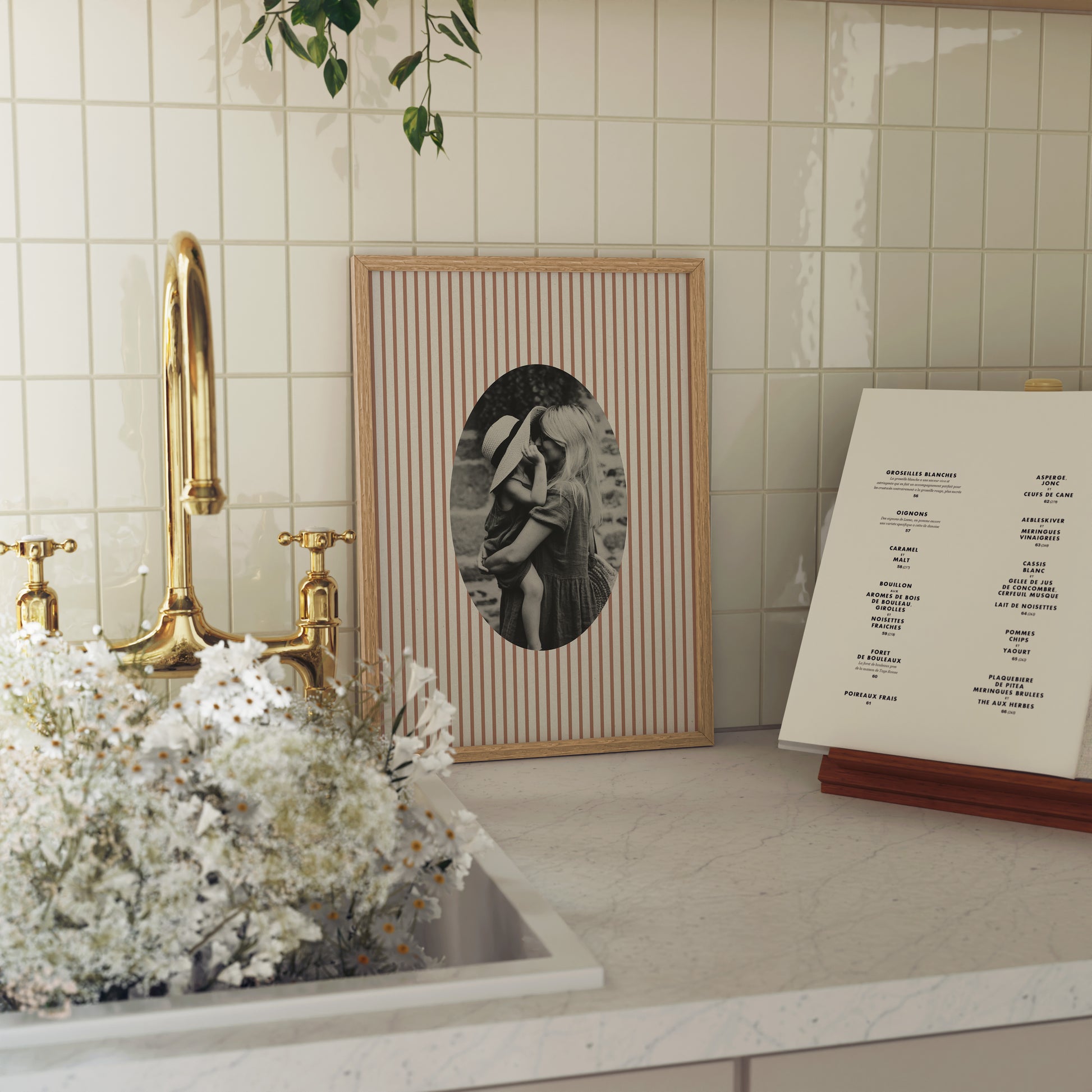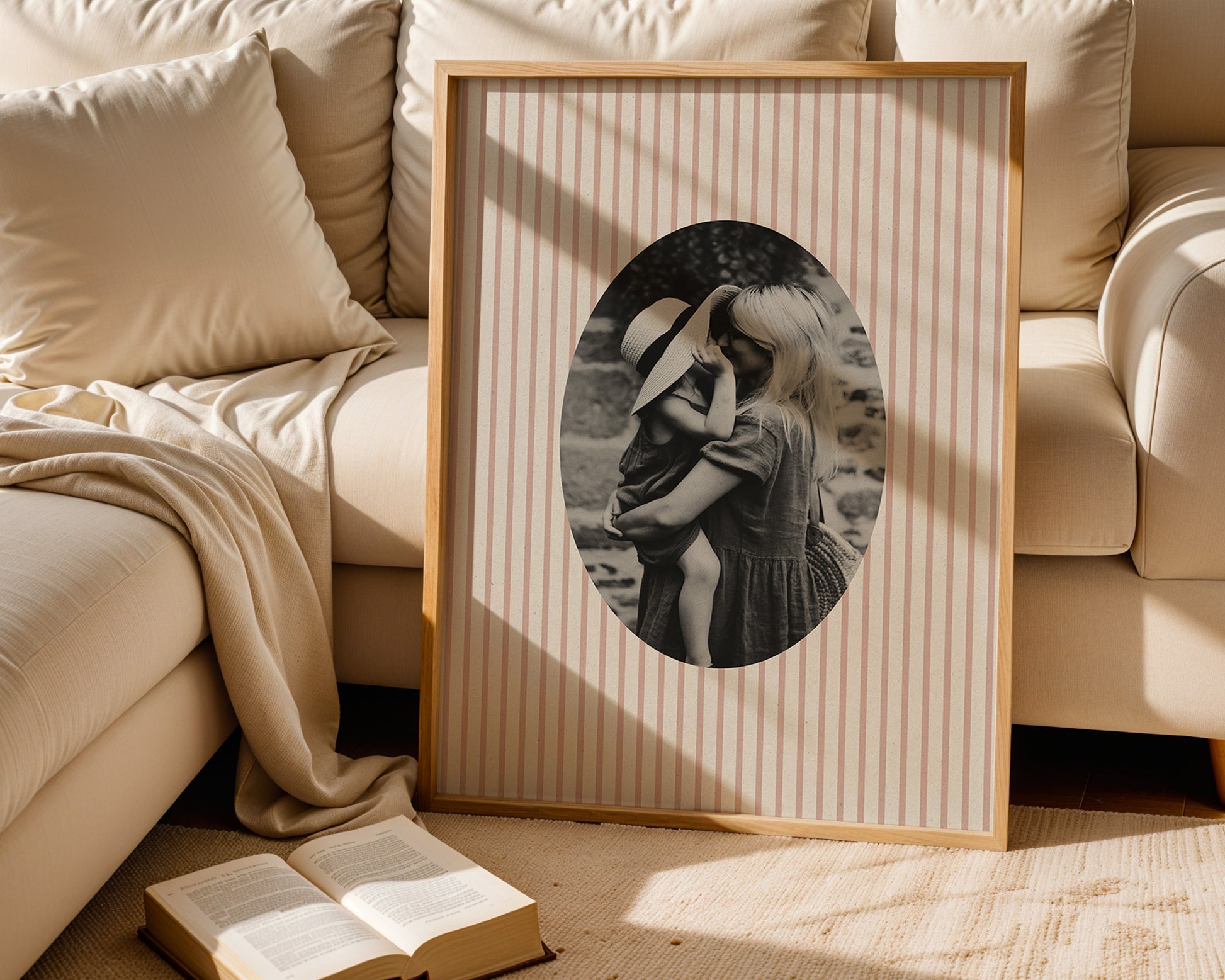 Discover our personalised stripe photo print, a timeless vintage inspired piece complete with a photo of your choosing, edited into black and white by us! With a soft, textured finish, this print echoes the classic look of linens and fabrics, combined with your most sentimental photos to create the perfect family portrait or a gift for your closest friends. This piece is a stunning addition to your wall decor, with a custom twist of adding your most favourite memories to your home.
