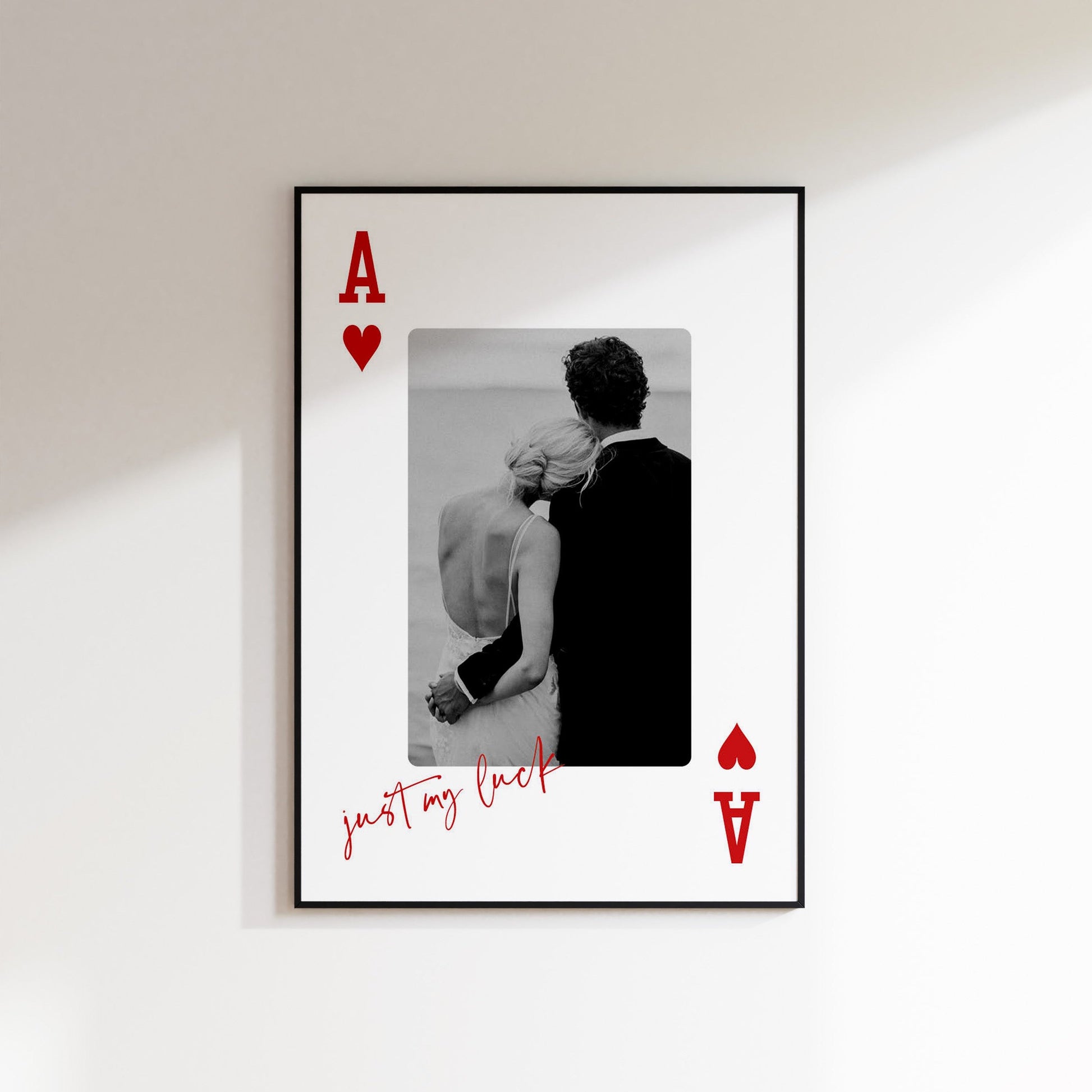 Transform your cherished memories into a unique piece of art with our Playing Card Print. This beautifully crafted print features a photo of your choice, framed in the iconic style of a playing card. Whether it's for a a 1st anniversary print or a personalised wedding gift, this timeless piece is a true crowd pleaser.